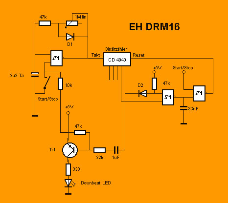Hier ist eine einfache Version von Electro Harmonix. Das Gerät besitzt sogar einen Trigger Out, der einfach am Schmitt Trigger angegriffen wurde. Die Downbeat LED wird durch den Q5 Ausgang des Binärzählers angesteuert. Der Reset Impuls durch eine Schaltung die auf Q4 und Q5 zugreift. Wichtig ist hier, dass der Start/Stop Schalter ständig eingeschaltet sein muss, d.h. Potential am Eingang des Schmitt Triggers liegen sollte. Dieses Potential muss auch am Gatter der Reset Schaltung anliegen.